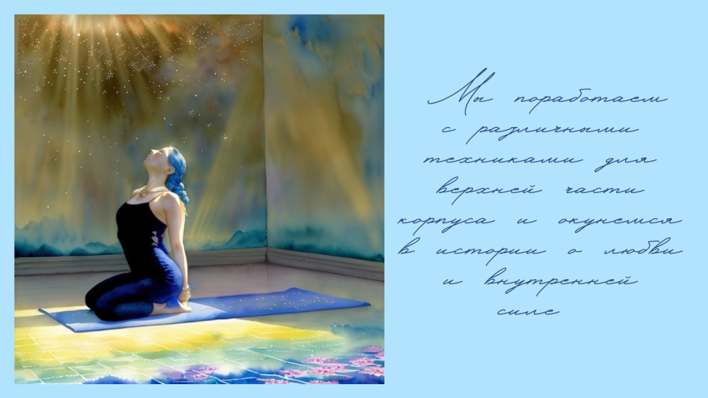 Мы поработаем с различными техниками, позволяющими сделать верхнюю часть корпуса свободнее и увереннее. И в дополнение к этой активной практической гимнастике мы окунемся в истории о любви, встретимся с персонажами известных произведений и, общаясь с ними, разберём различные психологические состояния, часто сопутствующие проблемам с осанкой и верхней частью спины.