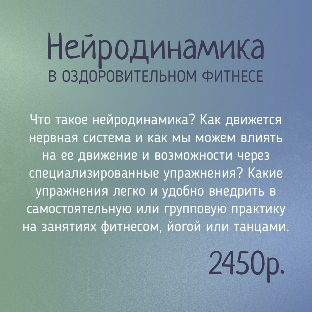 Нейродинамика в оздоровительном фитнесе. Что такое нейродинамика? Как движется нервная система и как мы можем влиять на ее движение и возможности через специализированные упражнения? Какие упражнения легко и удобно внедрить в самостоятельную или групповую практику на занятиях фитнесом, йогой или танцами.