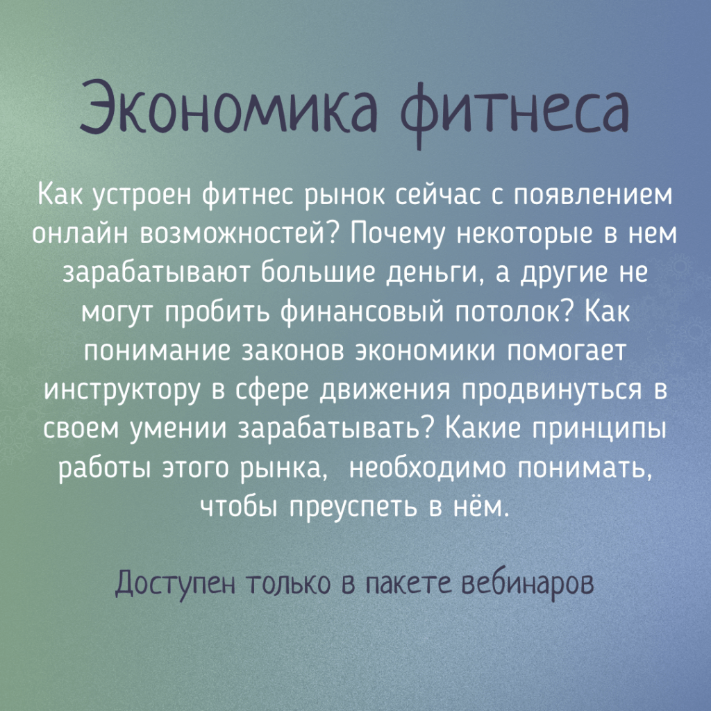 Экономика фитнеса. Инструктору важно разбираться не только в анатомии и упражнениях, но и в том как устроен рынок его профессии. Как работает фитнес рынок сейчас с появлением онлайн возможностей? Почему некоторые в нем зарабатывают большие деньги и другие не могут пробить низкий финансовый потолок? Как понимание законов экономики помогает инструктору в сфере движения продвинуться в своем умении зарабатывать? Бытовые принципы работы этого рынка, которые необходимо понимать.