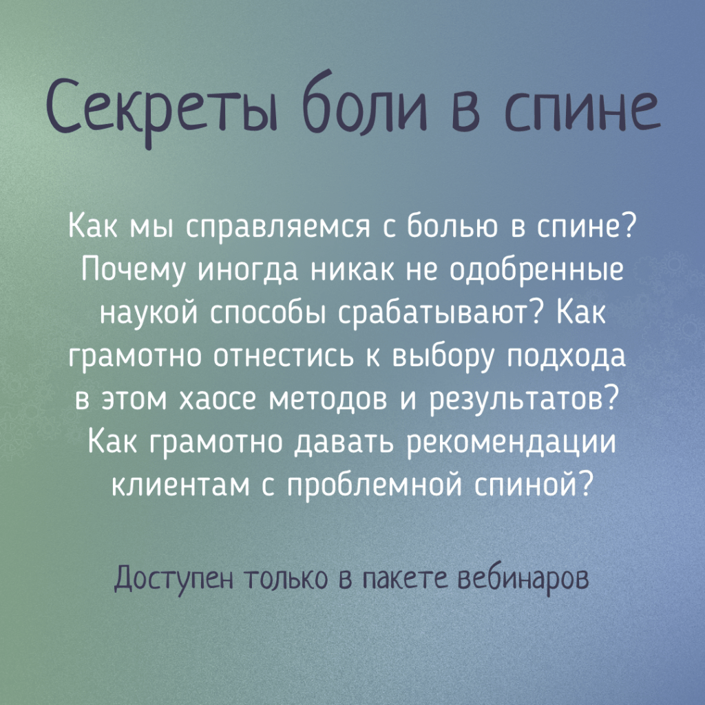 Секреты боли в спине и методов для её лечения. Почему иногда никак не одобренные наукой способы срабатывают? Как грамотно отнестись к выбору подхода в этом хаосе методов и результатов? Как грамотно давать рекомендации клиентам с проблемной спиной?