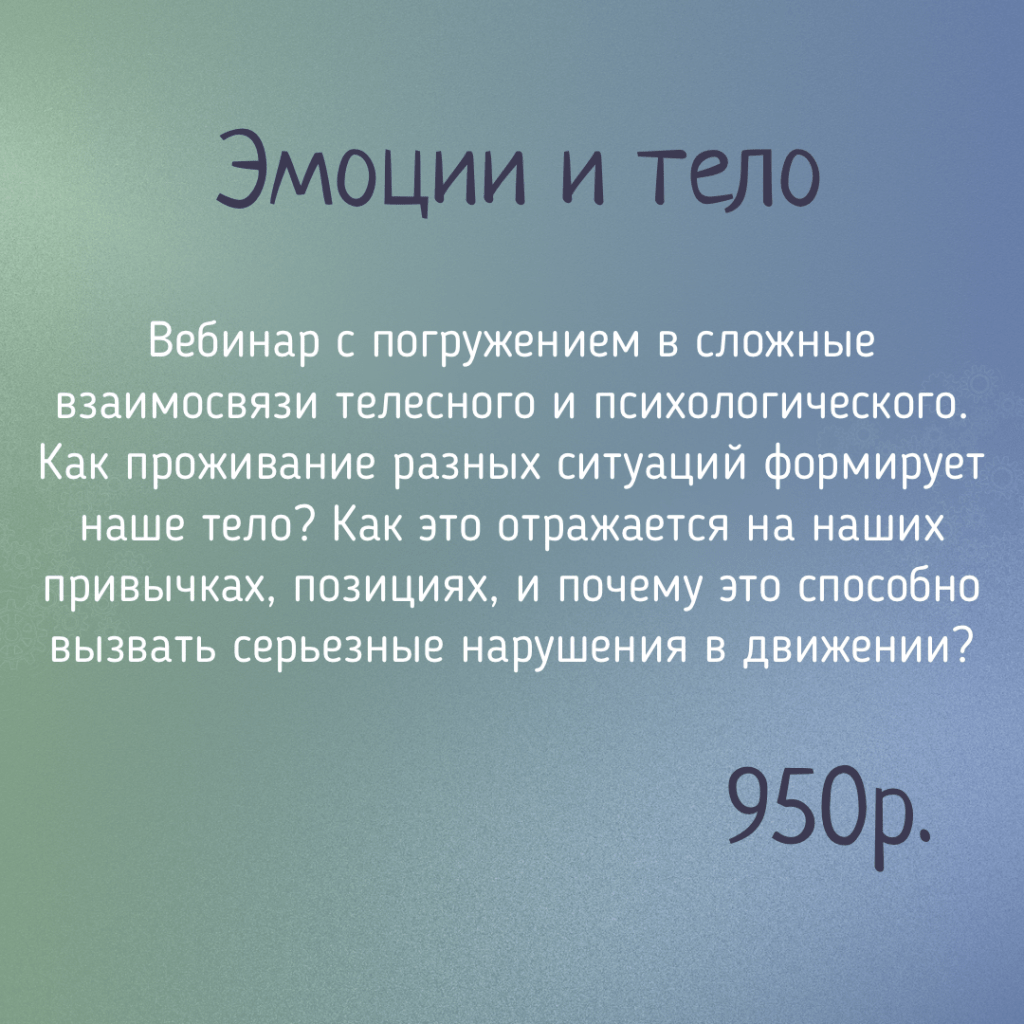 Эмоции и тело: вебинар с погружением в сложные взаимосвязи телесного и психологического. Как проживание разных ситуаций формирует наше тело? Как это отражается на наших привычках, позициях, и почему это способно вызвать серьезные нарушения в движении?