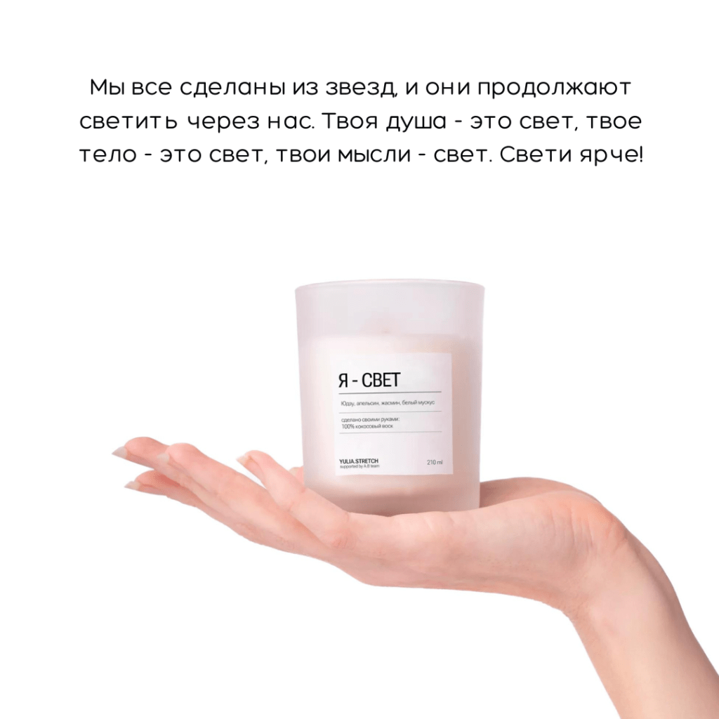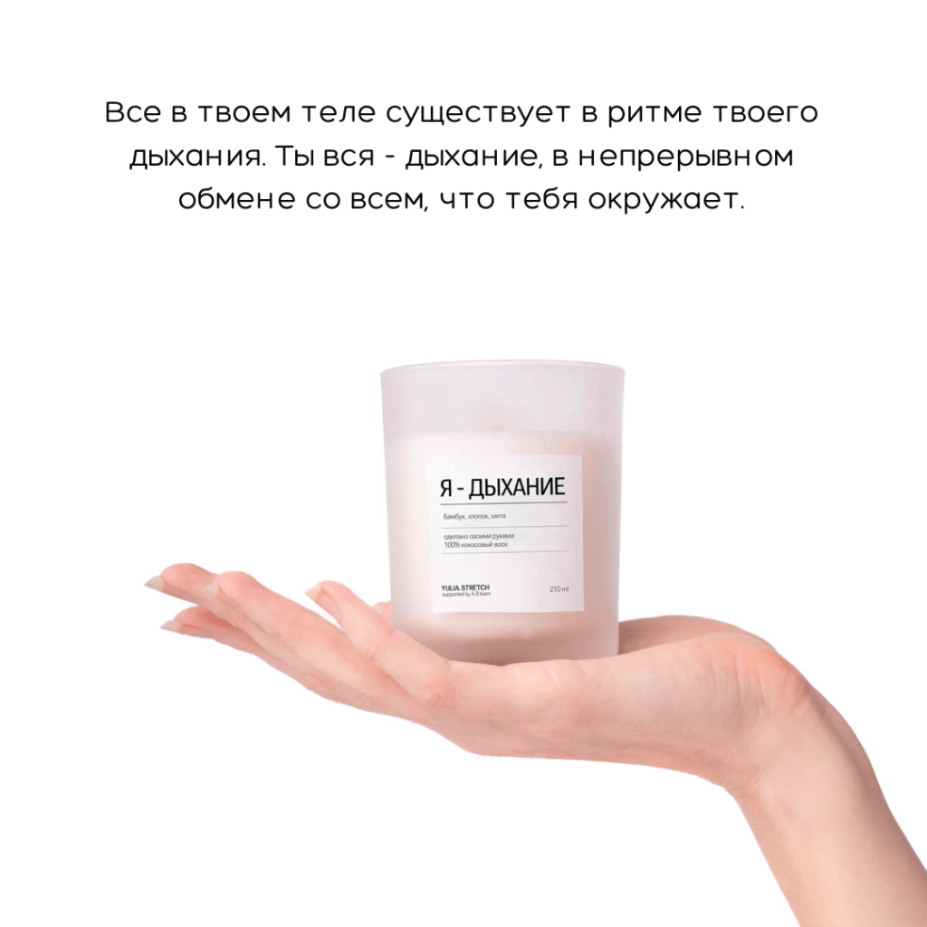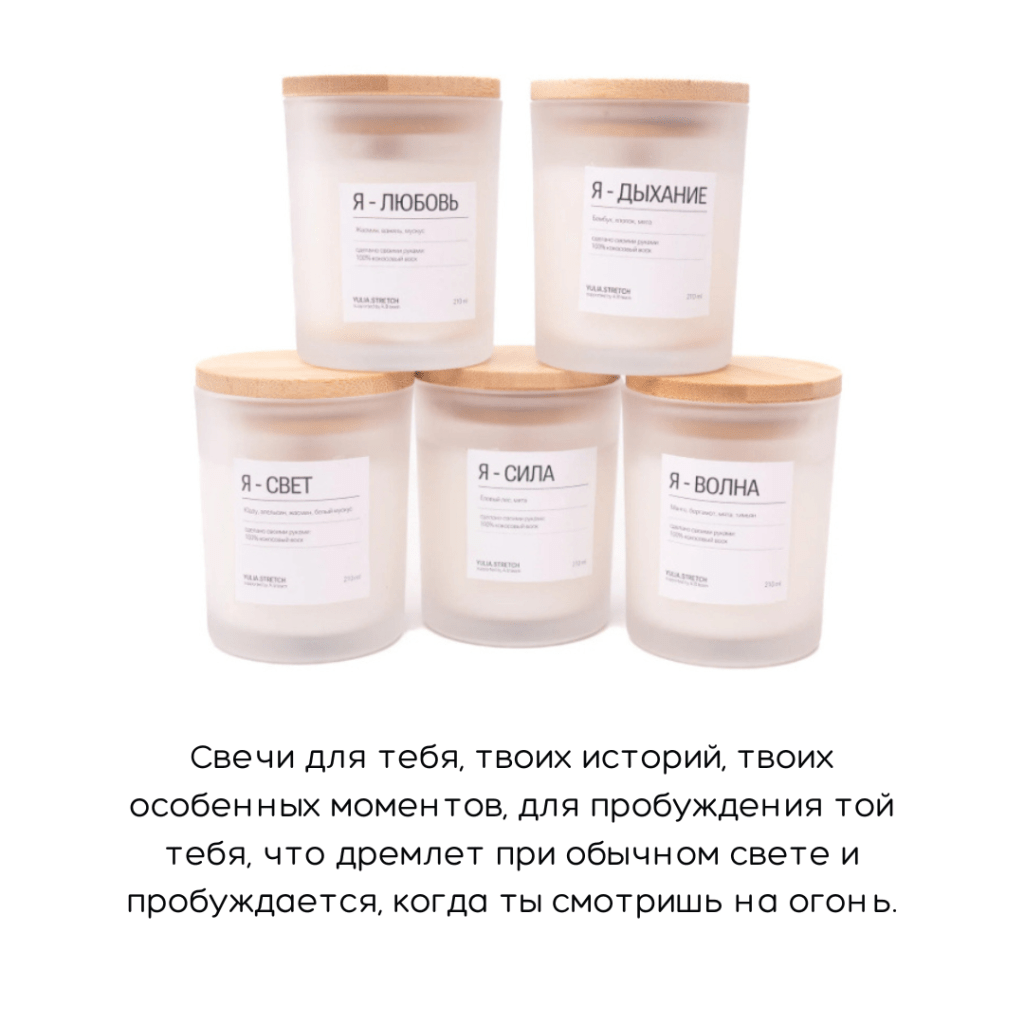 Пять новых ароматов, чтобы создать атмосферу для восстанавливающих ритуалов. Новая линия свечей для студий йоги и растяжки, которые не только освежают интерьер, но и содержат в себе послания о внутренних состояниях, необходимых для эмоционального баланса. Натуральный кокосовый воск премиального качества можно наносить на кожу, он прекрасно смягчает ее, особенно сухие участки. Уникальные ароматические композиции позволяют погрузиться в мир чувств и ощущений. При покупке свечи вы так же получаете доступ к программе для проведения индивидуального восстанавливающего мини-ретрита.