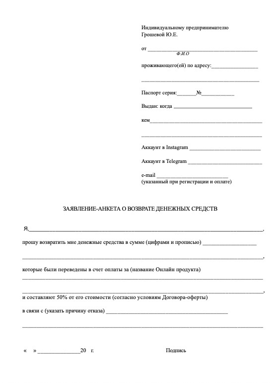 7.5. В случае если Заказчик оплатил Онлайн-продукту или другую услугу, но впоследствии принял решение отказаться от прохождения Онлайн-продукта, он обязан уведомить об этом техническую поддержку Исполнителя (https://t.me/yuliastretchsupport), направив ему соответствующее письменное Заявление-анкету согласно Приложению 1 к настоящему Договору.